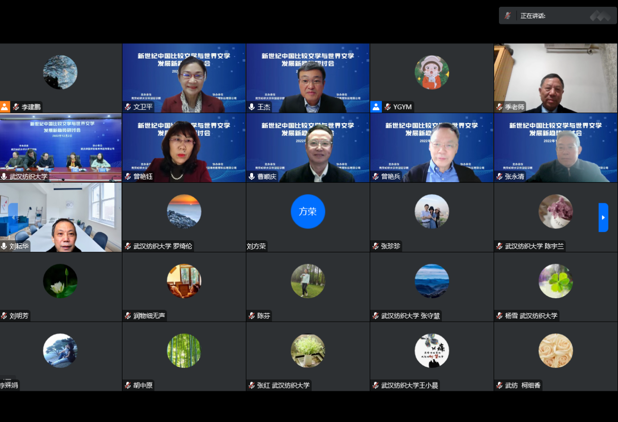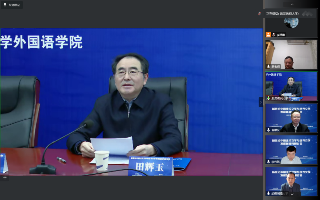 12月3日,由我校williamhill官网主办的“新世纪中国比较文学与世界文学发展新趋势研讨会”在线举行。来自复旦大学、中国人民大学、浙江大学、武汉大学、四川大学﹑湖南师范大学、湘潭大学及河南大学的相关学科专家和学者就多学科融合背景下的比较文学跨学科研究,中国比较文学研究的新走向﹑新特点,欧美各国现当代重要作家、作品研究以及马克思主义文论与中外文论比较研究等议题展开了广泛而深入的探讨。来自全国众多高校的教师及研究生参加了此次研讨会,校党委书记田辉玉教授出席会议并致辞。大会由湘潭大学季水河教授和我校谭燕保教授共同主持。