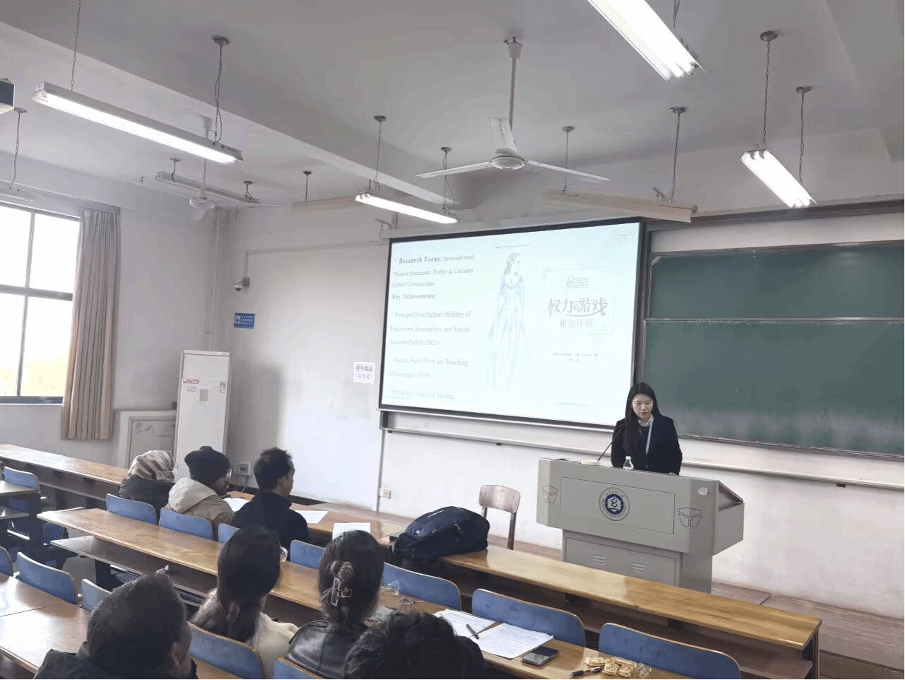 为进一步提升我校来华留学生的专业汉语水平,增进其对中国纺织服饰文化的理解,近日,williamhill官网周丹教授为纺织工程专业的留学生们带来了一场题为《解码语言的经纬》(Decoding the Fabric of Language)的精彩讲座。讲座以“纺织汉语”为切入点,通过生动的双语教学与沉浸式互动,带领留学生们开启了一段探寻中华文明“经纬”的文化之旅。