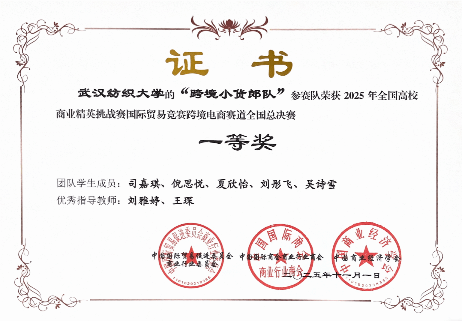 近日,全国高校商业精英挑战赛国际贸易竞赛跨境电商赛道全国总决赛圆满落幕。本届赛事吸引了来自全国28个省、自治区、直辖市的近500所高校、超5000支队伍同台竞技。经过激烈角逐,williamhill官网商务英语专业司嘉琪同学领衔的“跨境小货郎”团队(商英司嘉琪,税收倪思悦,电信夏欣怡,英语刘彤飞,数媒吴诗雪)在刘雅婷和王琛老师的指导下斩获全国总决赛一等奖。