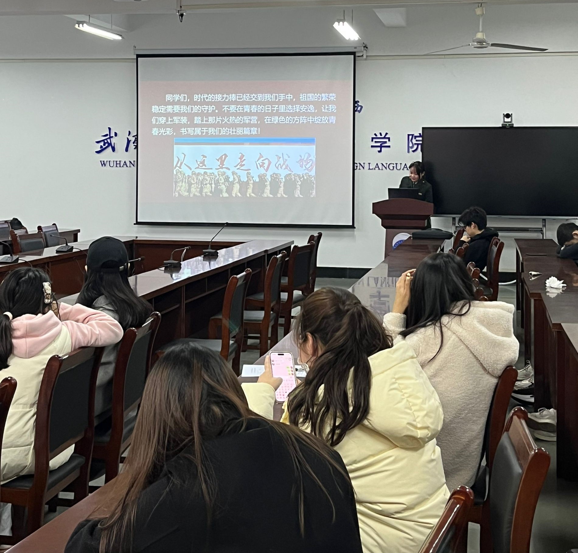为积极响应国家征兵号召,激发青年学子参军报国热情,11月23日晚,学院全体辅导员通过年级大会形式,开展第十二周“携笔从戎砺青春,热血报国正当时”主题班会暨征兵宣传“三个一”活动。本次班会特邀退役大学生士兵讲述军营经历,生动展现了部队生活的真实风貌,点燃了同学们的参军报国之志。