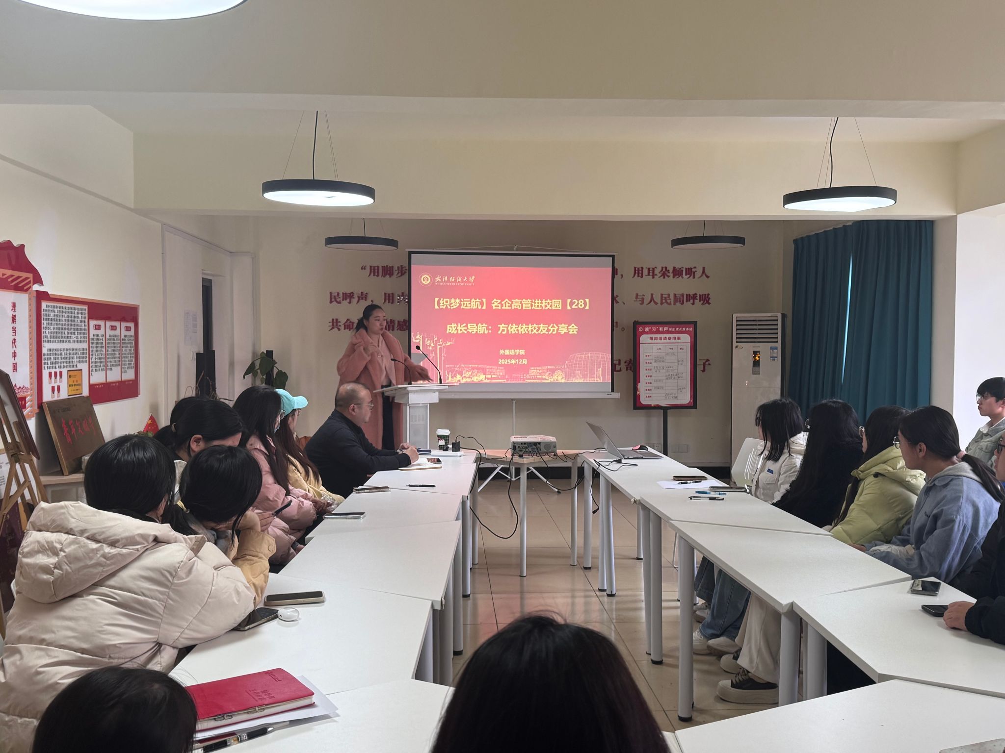 为引导学生树立文化自信、拓展国际视野,激励学生在新时代背景下勇于创新与实践,12月18日,williamhill官网承办学校“名企高管进校园”活动,特邀湖北衣等依服饰有限公司总经理方依依女士担任主讲嘉宾,围绕“创业心路与中国传统服饰出海”为主题,学院党委副书记彭阳慈航与学院本科生、研究生一同聆听讲座,开展交流。
