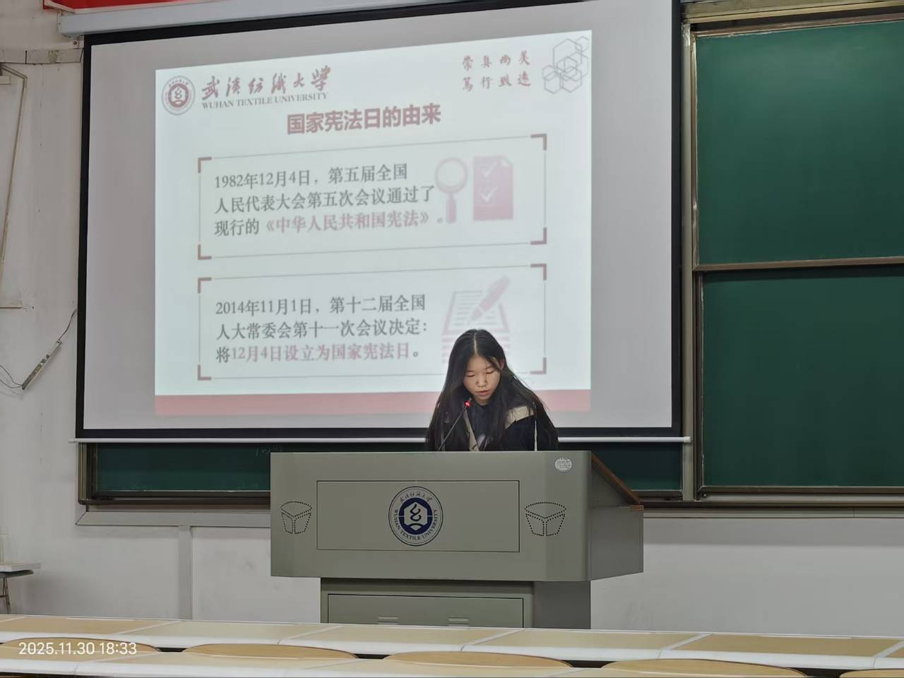 班会重点阐述了宪法精神的内涵与时代意义,包括坚持社会主义本质特征、维护民族团结与国家统一、弘扬改革开放精神以及实事求是的原则。同学们结合自身实际,就宪法与大学生权利义务的关系展开讨论,涵盖平等权、人身自由、宗教信仰自由、监督权等多项宪法赋予的基本权利与义务。时值2025年“宪法宣传周”,班会还介绍了教育部及相关单位组织开展的系列宣传活动,如“法治青年说”“宪法卫士”行动计划、“宪法晨读”等。学院鼓励同学们积极参与线上学习与实践活动,争做“宪法卫士”,将法治精神融入日常学习与生活。