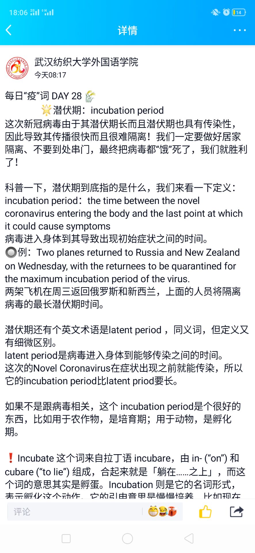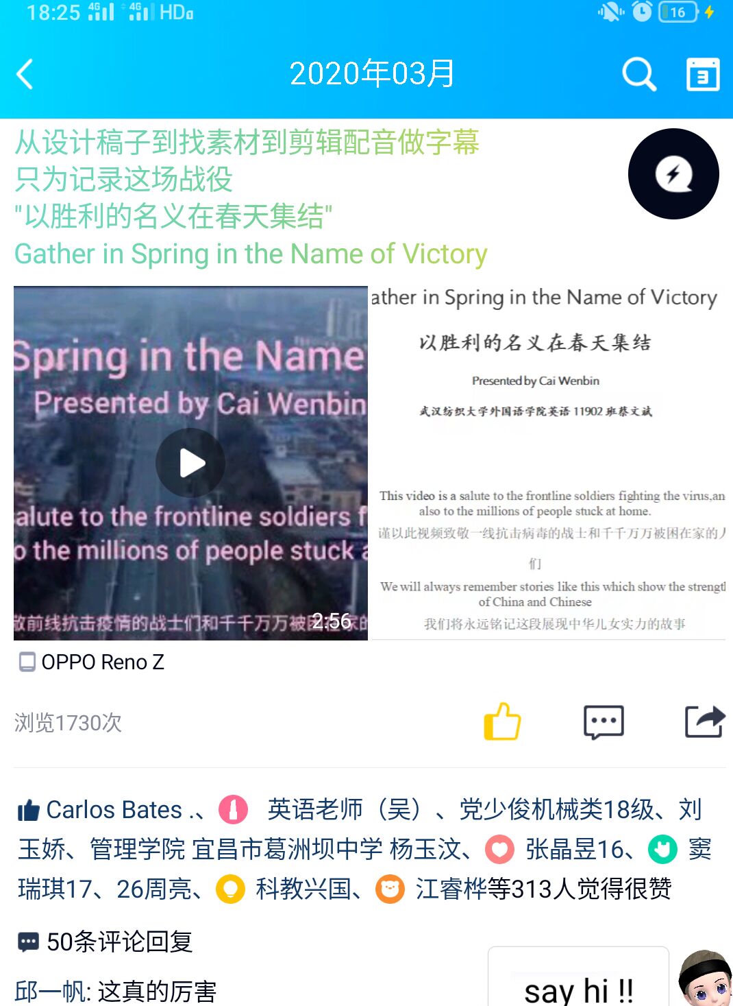 自疫情发生以来,我看到空间里涌现了一些为抗击疫情,歌颂一线医务人员和志愿者的视频,深受感动,我也有了想做一个抗疫视频的想法。但是在完成好网课任务和做视频之间总是犹豫不决。不久看到了williamhill官网发布的征集英文演讲视频的通知,我更坚定了自己的选择。3月12日写稿,13,14日找素材,15日剪辑,改稿,16,17日剪辑配音,一周之内“速成”了我的第一个视频“Gather in Spring in the Name of Victory”(以胜利之名在春天集结),视频上传到youtube,微博和QQ空间后收到了海内外网友们的留言支持。在新冠病毒蔓延全球的今天,我想这不仅仅是对中国抗疫的记录,也是对其他各国的鼓励,中国能挺过来,其他国家也能挺过来,就像视频中讲到“Precisely because of these protectors,our victory is close at hand”正是有了这些保护我们的人,胜利即将到来。