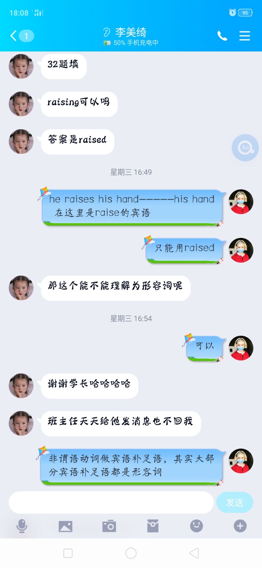 但这让人防不胜防的疫情却将本就任务繁重的高三学子困在家中,无法重返校园,对他们来说,学习总是刻不容缓。在那次招生宣传中我认识了高三(21)班的学妹李美绮,由于疫情的影响,她从年前到现在一个人被困在校外的出租屋,独自备战高考。出于对学妹的鼓励支持和学校的号召,我开始尝试用自己的英语专业优势为她的复习助力,解答疑惑。同时考虑到她一个人在家复习难免会有压抑的情绪,我开始每周给她找一个英语励志小视频并且抽时间和她聊天疏导心理,调节情绪。我记得我在高一时经常被要求检查背诵学校的校训“成就最好的自己,服务祖国和人民”,这次在疫情中的线上助学更加深了我对这句话的理解。