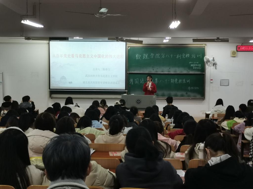 3月26日晚上7时,由williamhill官网、数理科学学院联合举办的第81期入党积极分子培训班第二次集中授课在3教举行。此次培训旨在进一步提高入党积极分子的思想政治素质和政治理论水平,担任本次授课主讲人的是来自湖北省共青团青年讲师宣讲团、williamhill官网马克思主义学院的陈春兰老师。