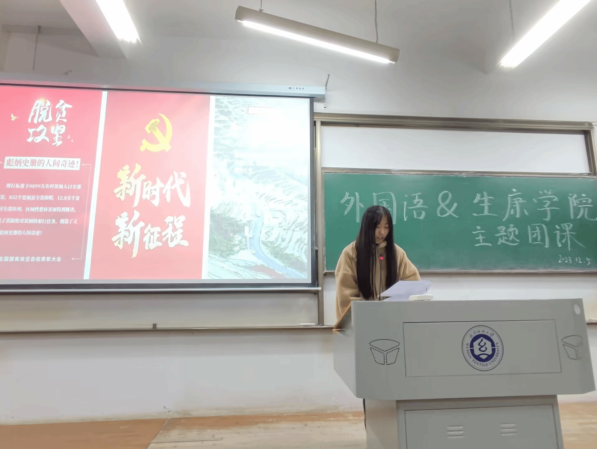 为积极落实习近平新时代中国特色社会主义思想进支部、进社团、进网络、进团课要求,williamhill官网各团支部于12月5日晚开展了“百生讲坛”活动。 学院英语12202班杨鑫炜、黄雅欣、罗晶莹、商英12202班高雯玥作为“百生讲坛”优秀主讲人分享了自己的主题演讲故事。